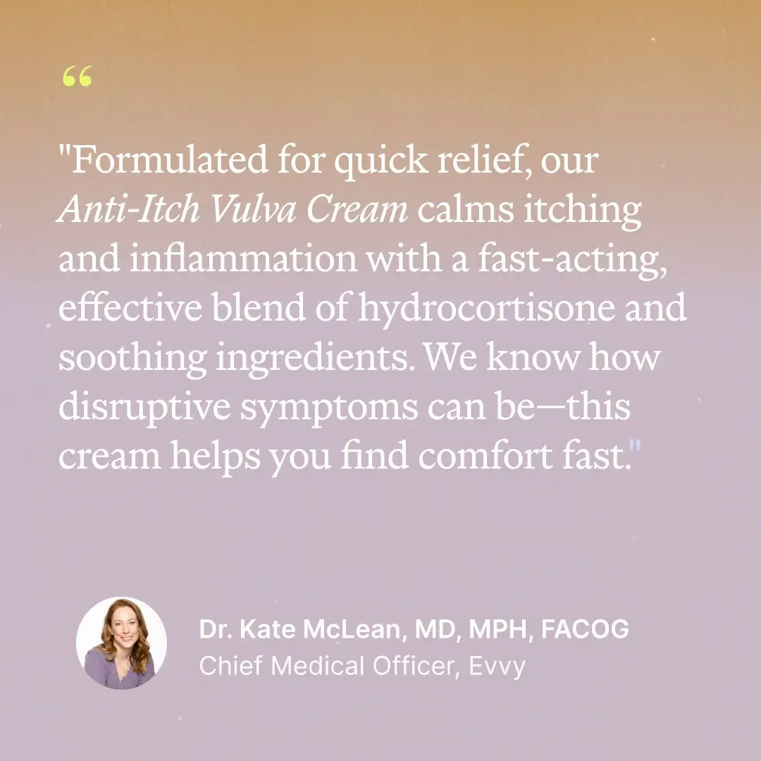 Evvy Anti-Itch Vulva Cream is a fast-acting, hormone-free topical cream designed to relieve external vulvar itching, redness, and irritation.